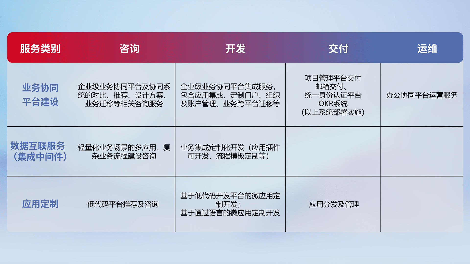 针对钉钉、、企微、、、、IDaas等平台级产品提供产品的规划、、、方案、、、交付、、、、定制化开发等服务,,,实现如统一协同办公、、智能客户服务、、、、混合会议管理、、、智能数据查询、、、、等业务场景,,,实现数字化转型。。。